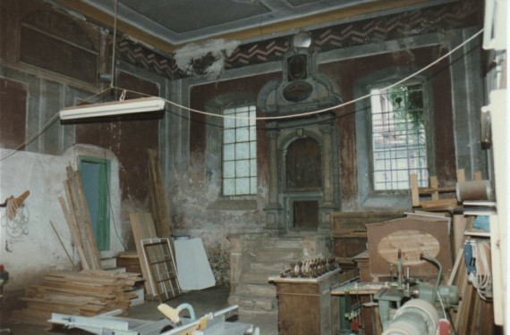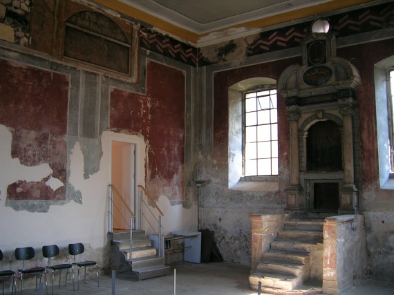 There were two further rooms located at the north side of the main room; accommodation for the Jewish teacher on the ground floor and the women’s gallery above, whose large windows covered with wooden ornamental lattices provided a view of the prayer room. In front of the main entrance on the south side, there was originally a porch from which one descended into the main room.